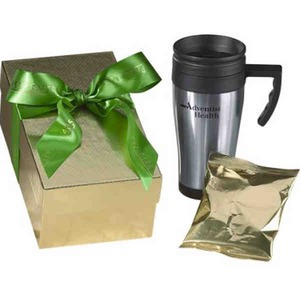 3 Day rush service - A promotional gift set that'll have them standing up and cheering! Presented in a gold gift box and wrapped with customized ribbon this travel mug would make an excellent present for the holidays. Not only do you receive a mug with your name or logo imprinted but a packet of hot chocolate as well. An ideal way to promote a new local cafe or ski mountain retreat destination they are also fitting gifts for teachers, managers and caregivers. Size approximately: 7 1/2" x 3 3/4" x 5 1/4". Setup charge: $45. We will custom imprint these Hot Chocolate Travel Mug Gift Boxes with your logo, text, or custom artwork!Questions? Call us at 1-800-958-4332!