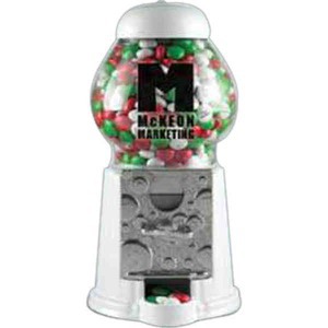 M&M chocolate candy gumball dispenser. Fill this classic white candy dispenser with three 7oz. bags of your personalized M&Ms. Made of cast iron with a glass top. Holds up to 21oz. of M&Ms. Personalize the container to continue to make a big m-pression long after the candy is gone. Pricing includes logo, photo and text imprinted on each candy, and imprint on front of dispenser. Dimensions: 9"h.We will custom imprint these M&M Chocolate Candy Gumball Dispensers with your logo, text, or custom artwork!Questions? Call us at 1-800-958-4332!